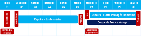 Les premières courses de ce Championnat seront lancées le vendredi 22 août après une journée dédiée aux inscriptions, préparatifs et vérification des jauges. Le soir aura également lieu le défilé des régions, un moment fort pour les jeunes Espoirs qui ouvriront la cérémonie d’ouverture sous les pavillons de leur région fièrement levés. Chaque jour, 3 courses seront lancées, si la météo le permet, pour créer un classement final par accumulation de points, pour le dernier jour désigner les Champions et Championnes de France 2025.